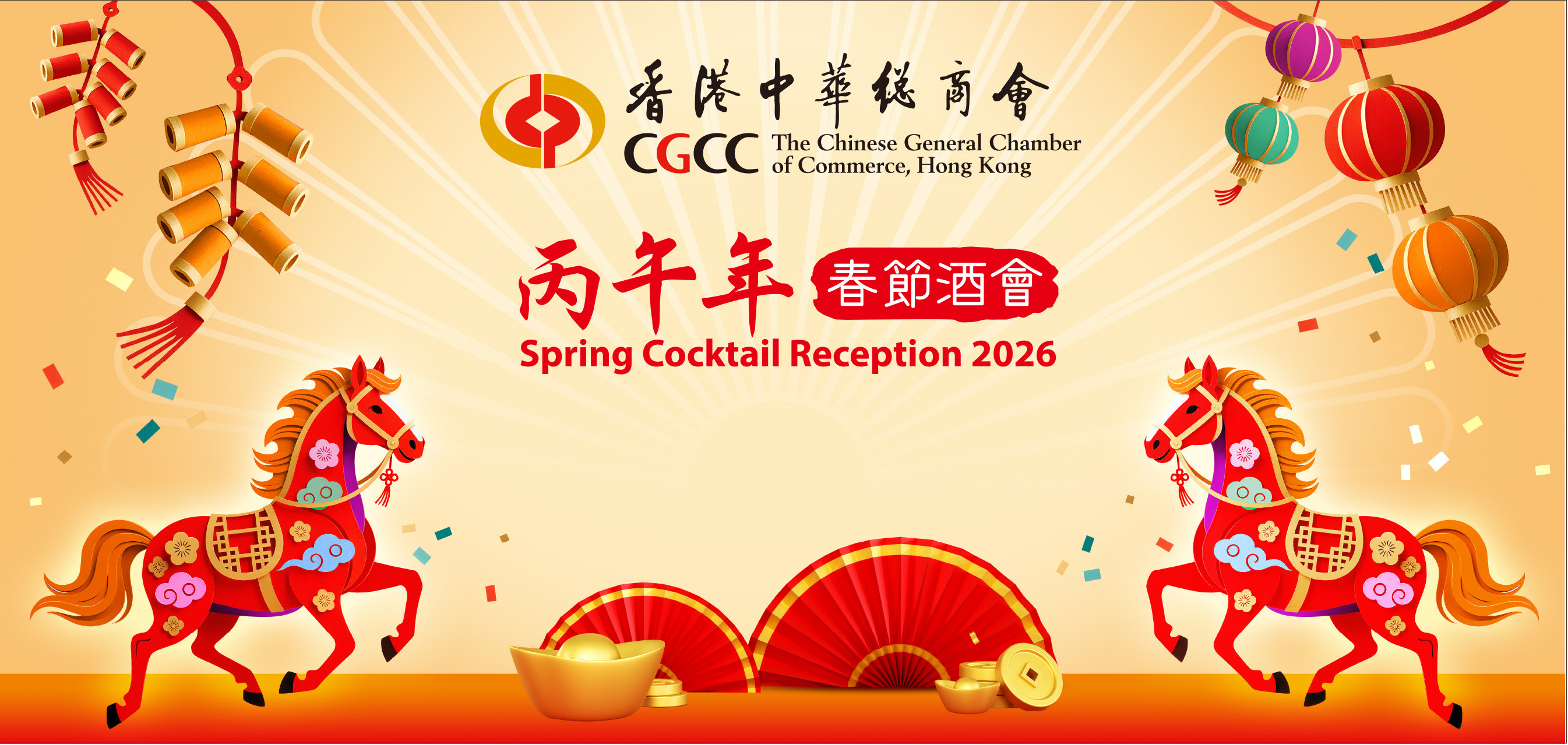 本會謹訂於2026年2月24日舉行丙午年春節酒會,邀請中外嘉賓逾千人出席,包括中央政府駐港聯絡辦負責人、特區政府官員、中國外交部駐港特派員公署負責人、全國人大代表、全國政協委員、外國駐港領事、工商翹楚以及各界友好等。行政長官李家超先生已應允擔任主禮嘉賓,歡迎各位會員踴躍參加。