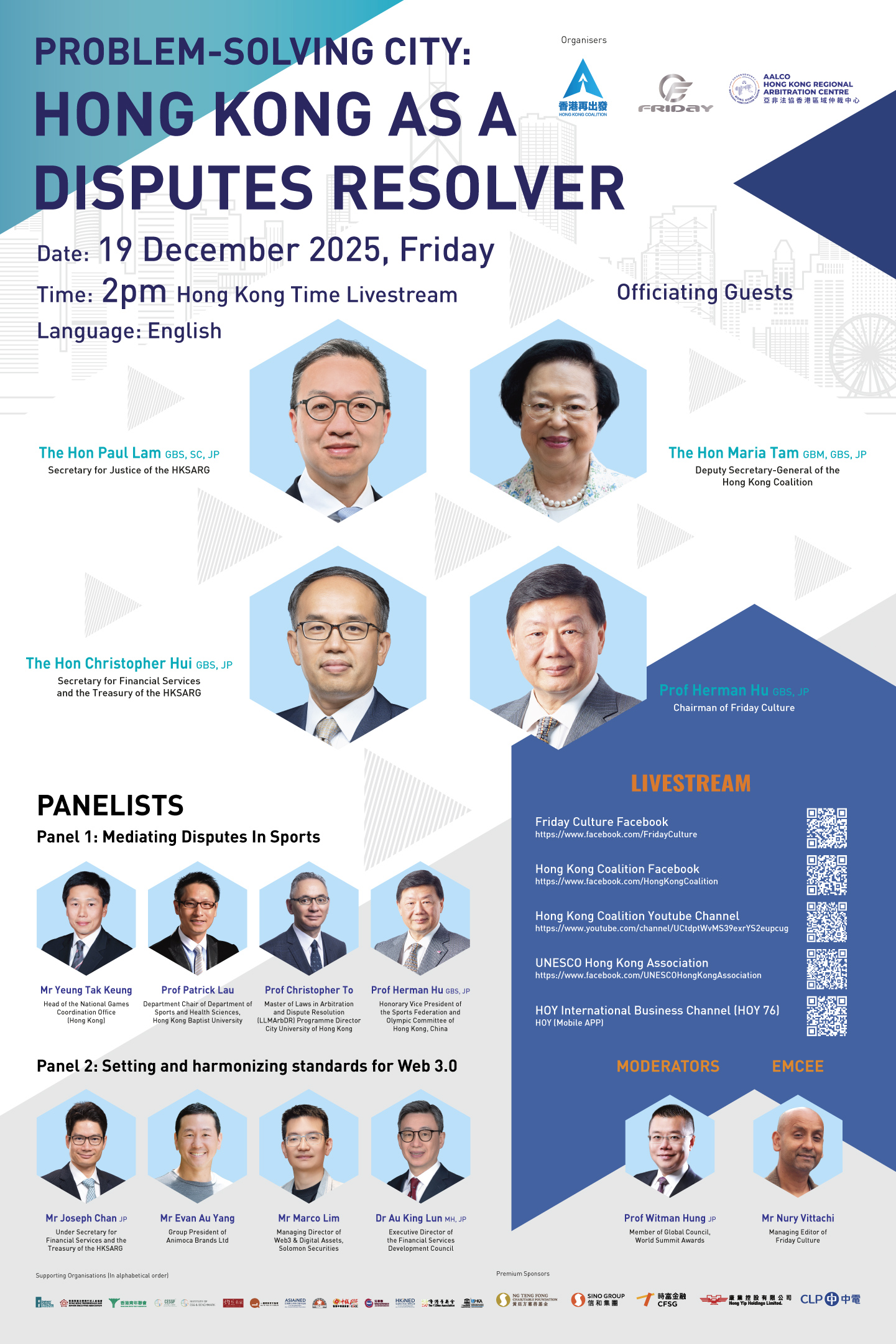 由 Friday Culture、香港再出发大联盟及亚非法协香港区域仲裁中心共同主办的国际论坛“Problem-Solving City: Hong Kong as a Disputes Resolver”将於2025年12月19日(星期五)下午2时至5时进行网上直播。多位重量级领袖及学者就「分论坛一︰体育界争议调解」(Panel 1: Mediating Disputes In Sports) 和「分论坛二︰Web 3.0之準则」(Panel 2: Setting And Harmonizing Standards For Web 3.0) 交流真知灼见。