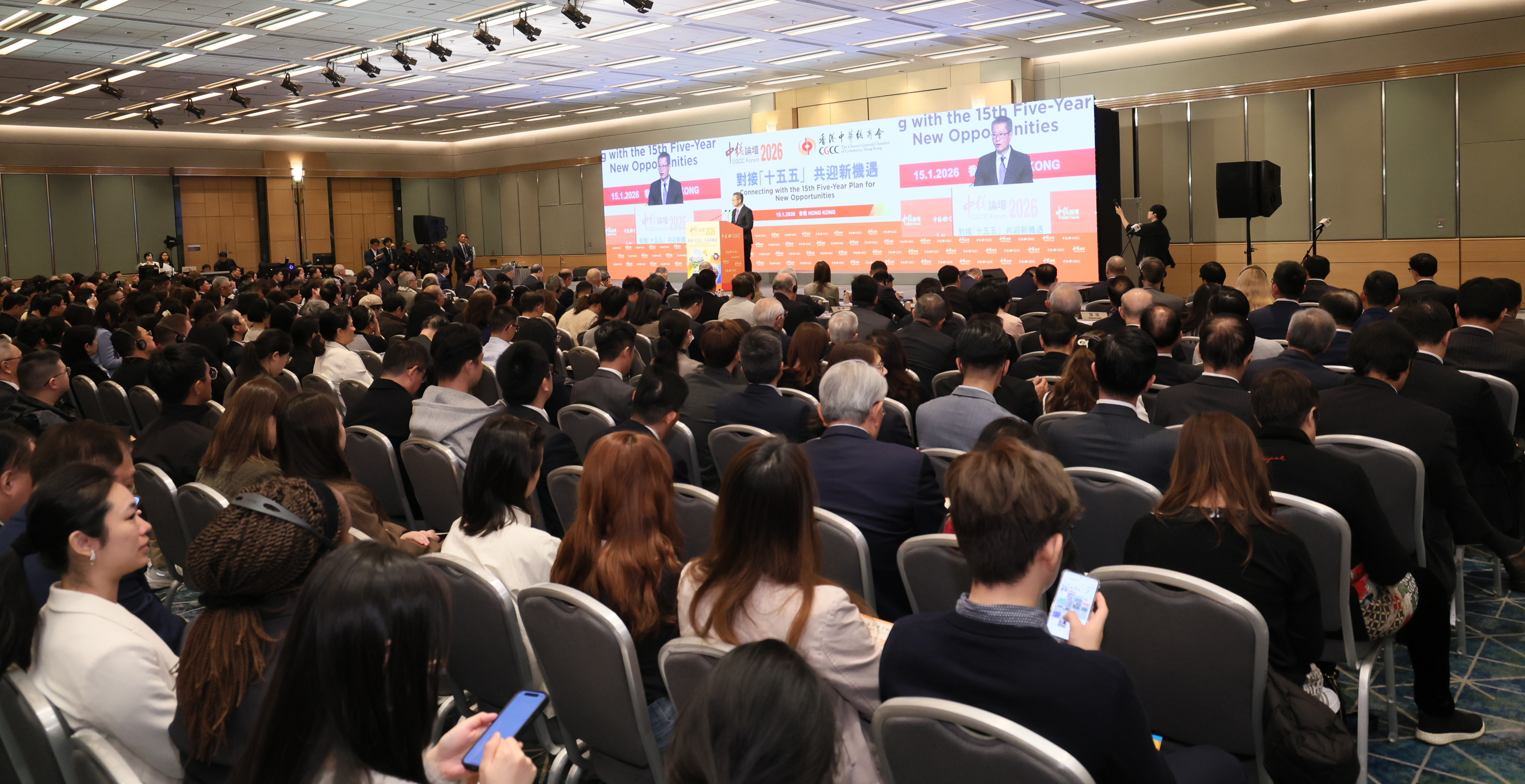 香港中華總商會今天(15日)舉辦「中總論壇2026」,以「對接「十五五」共迎新機遇」為主題,邀請財政司陳茂波司長擔任主旨演講嘉賓,探討新一年香港經濟前景及「十五五」規劃新局。中國社會科學院學部委員、十三屆全國人大常委蔡昉教授,京東集團副總裁、首席經濟學家及京東經濟發展研究院院長沈建光博士擔任專題演講嘉賓,剖析「十五五」規劃與環球經濟新格局。